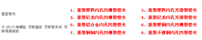 应用领域:本产品适用于冶金,石油,化工,车辆,船舶,电力等机械液压系统中的油、水、气为介质的固定管道。重型系列管夹适用于中高压(PN≤31.5Mpa)管道固定。