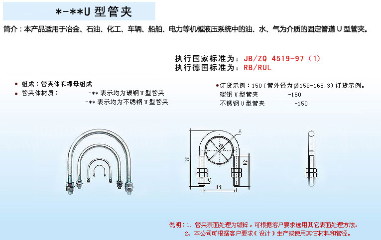 应用领域:U型管夹适用于冶金、电力、化工、机械等行业的管道固定。